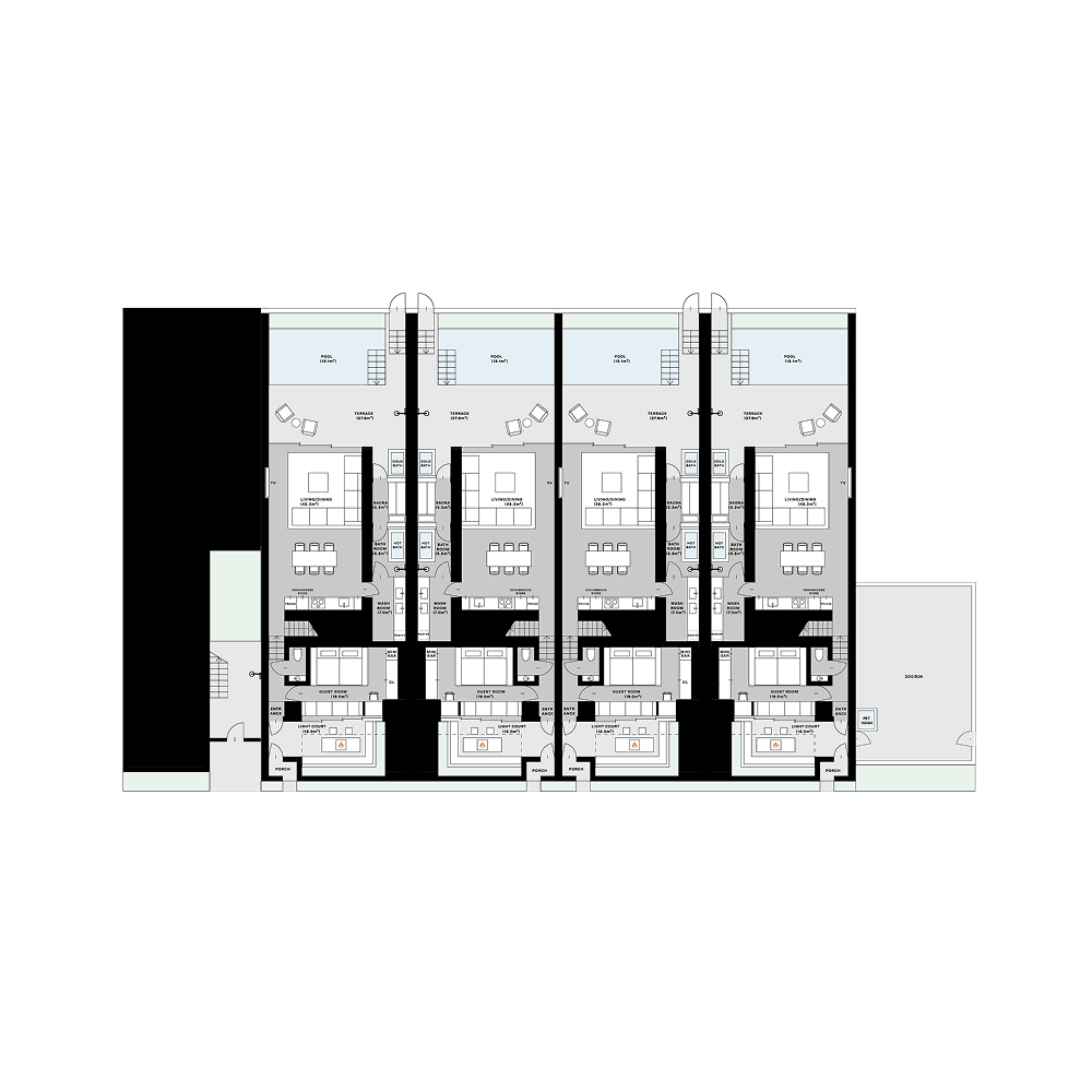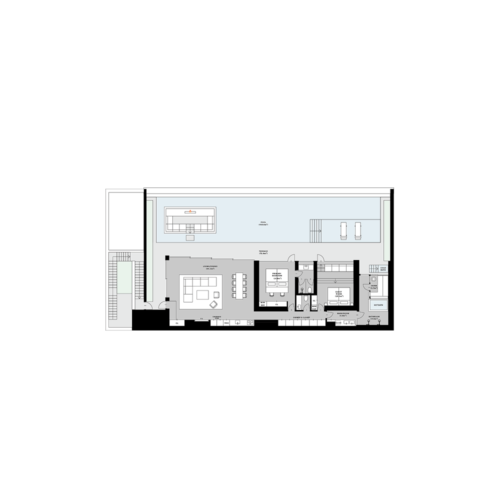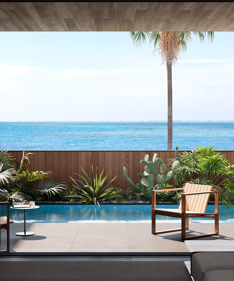 「COAST」は、海岸沿いに面した青島の特等席に位置し、海で過ごすも、プライベートプールで泳ぐも、その時々の気分に合わせて贅沢に選択できます。2ベッドルームのメゾネット形式の建築で、家族での利用にも最適です。リビングは天井高3.2mの開放的な空間となっています。