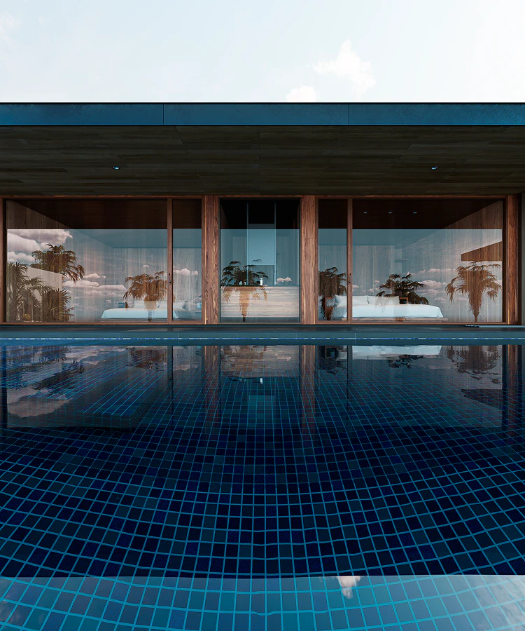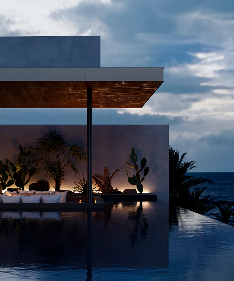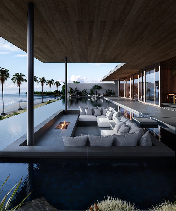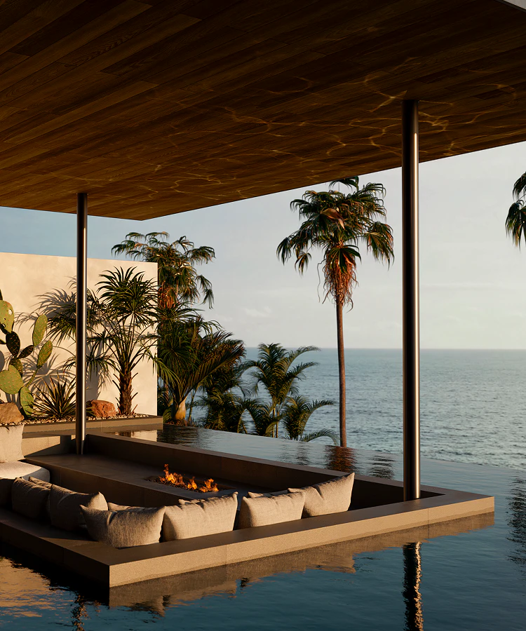 「CHILL 2.0」は、どの部屋で目覚めても海辺の景色から一日が始まり、直結するテラスからプールへアクセスが可能です。プールに浮かぶ掘り込みソファでは、ファイアプレイスの炎に包まれながら夜風を楽しむことができます。