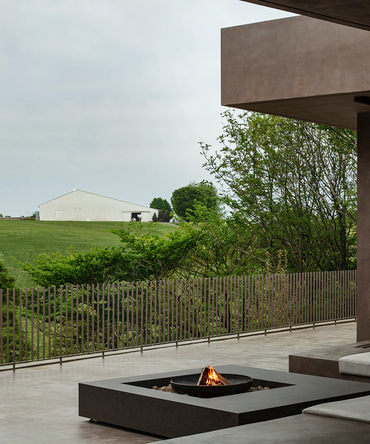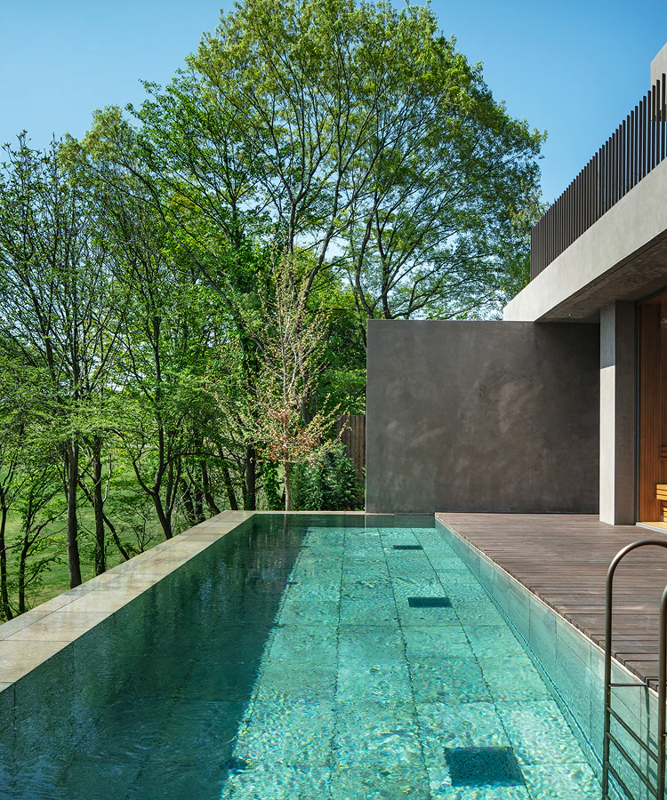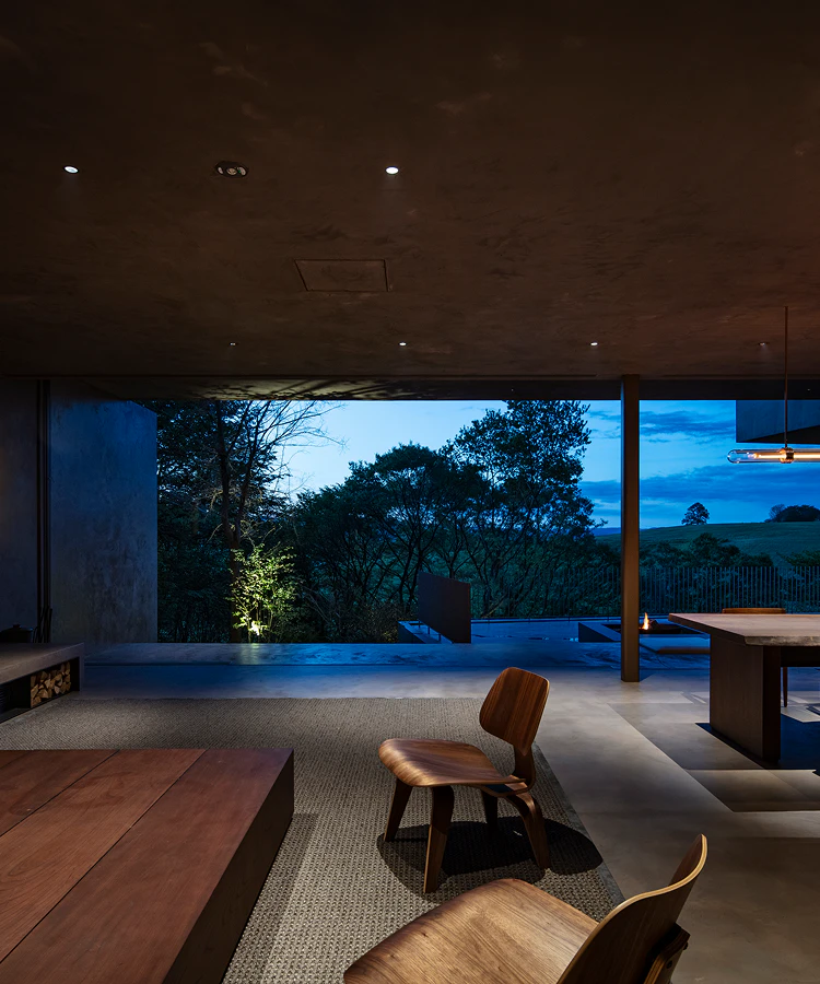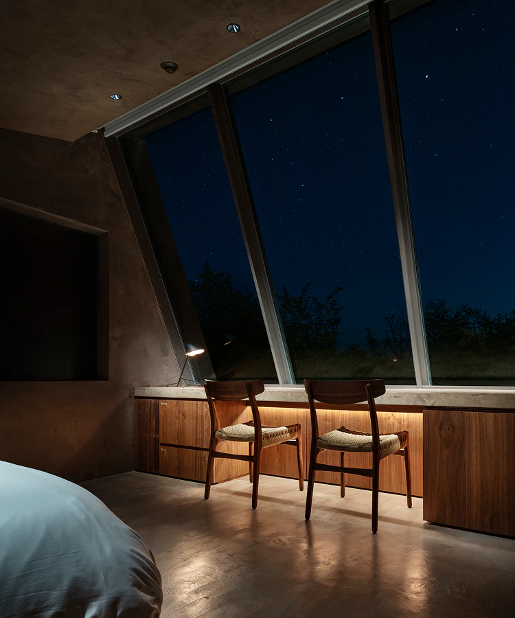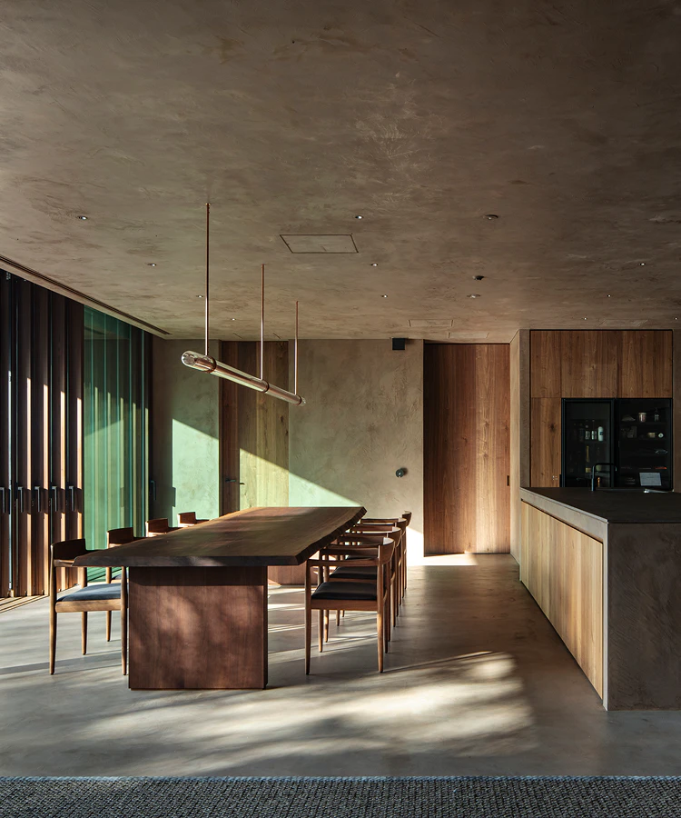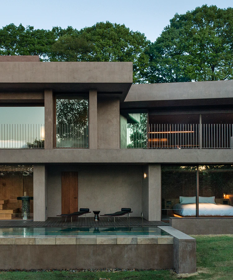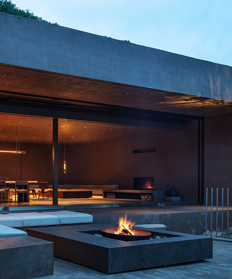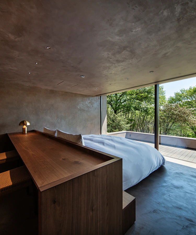 コンクリートやモールテックスの質感が風景と溶け合い、時間の経過とともに自然の一部となることを意図している。テラスを含む総面積は480㎡超で、プライベートプールやサウナ、温泉を備え、最大6名が宿泊可能。暗がりに差し込む光、水面に空を映すプール、炎が揺らぐテラスなど、自然の要素が設計に織り込まれ、静けさの中に深い豊かさを感じさせる空間である。人工と自然の境界を消し去り、人の感覚を再び“整える”ための建築として構想された。