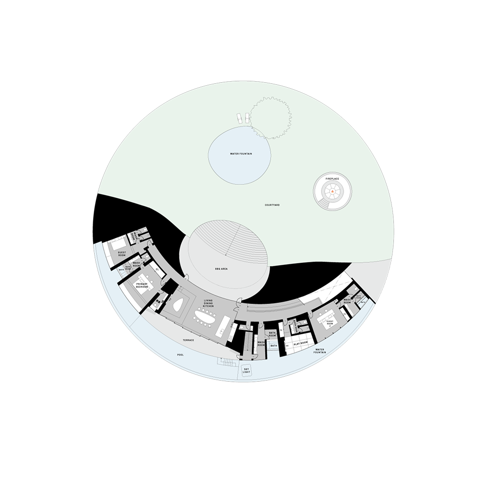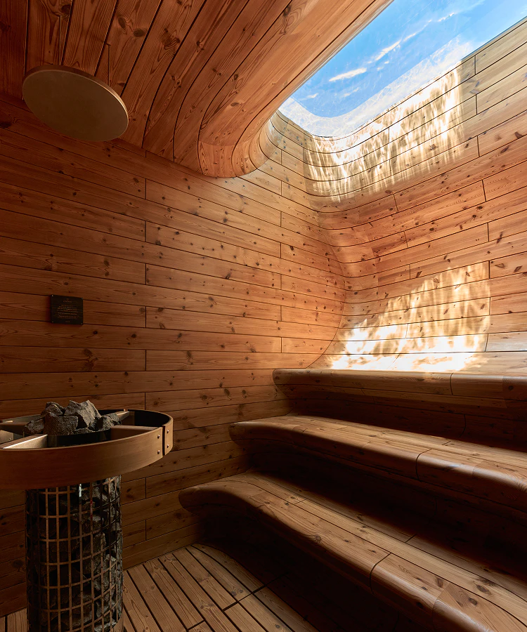 屋内面積は約975㎡、プールやテラスを含む総面積は約1,500㎡で、最大10名が宿泊可能な4ベッドルームを備える。内部には海を望むリビング・ダイニング、光が水盤越しに差し込むサウナ、中庭には子ども用プールや焚火スペースを設けるなど、自然と一体化した構成となっている。