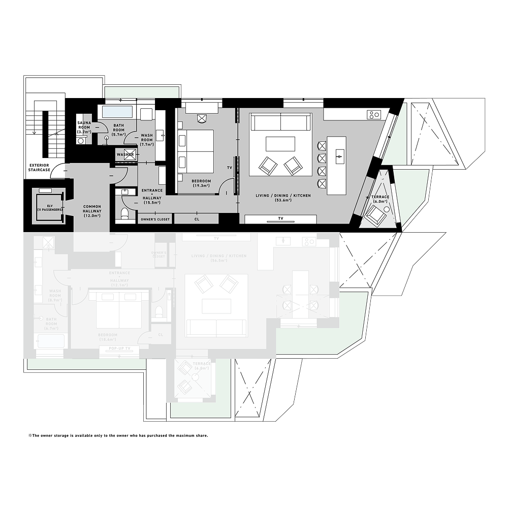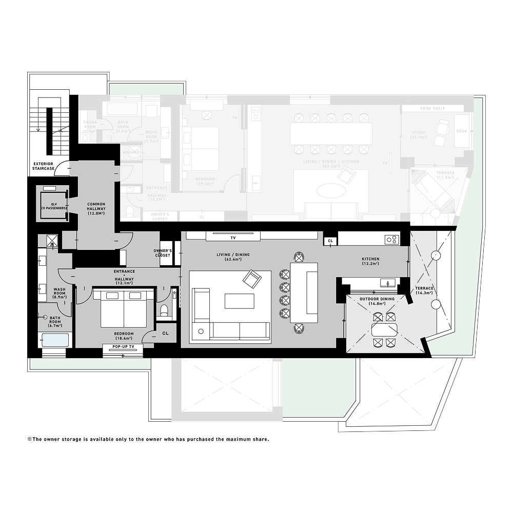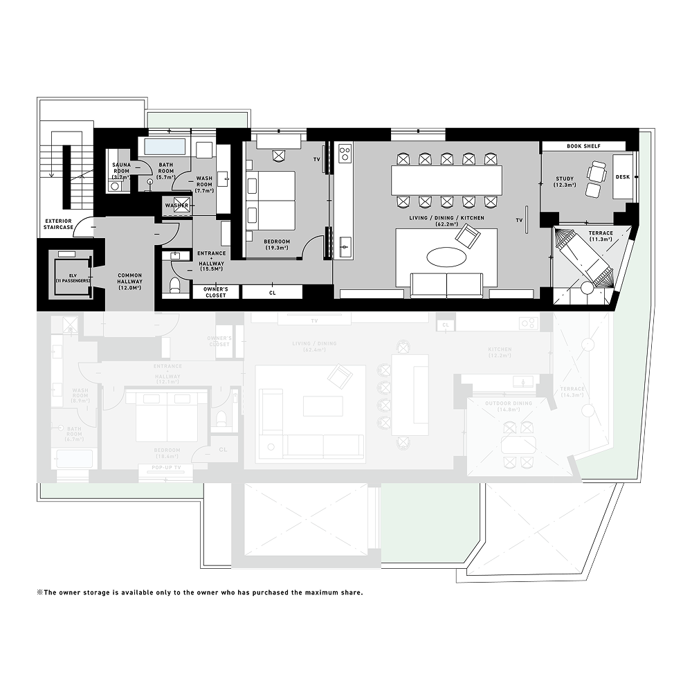 +PENTHOUSE:253.4㎡(119.1㎡ + 134.3㎡) +SOUND:113.48㎡(107.5㎡ + 5.98㎡) +BAR:114.36㎡(108.41㎡ + 5.95㎡) +RETREAT:142.39㎡(125.21㎡ + 17.18㎡) +ATELIER:126.90㎡(117.02㎡ + 9.88㎡) +CHEF:154.79㎡(125.7㎡ + 29.09㎡) +DESK:140.77㎡(129.51㎡ + 11.26㎡) +DOMA:172.66㎡(123.13㎡ + 49.53㎡)