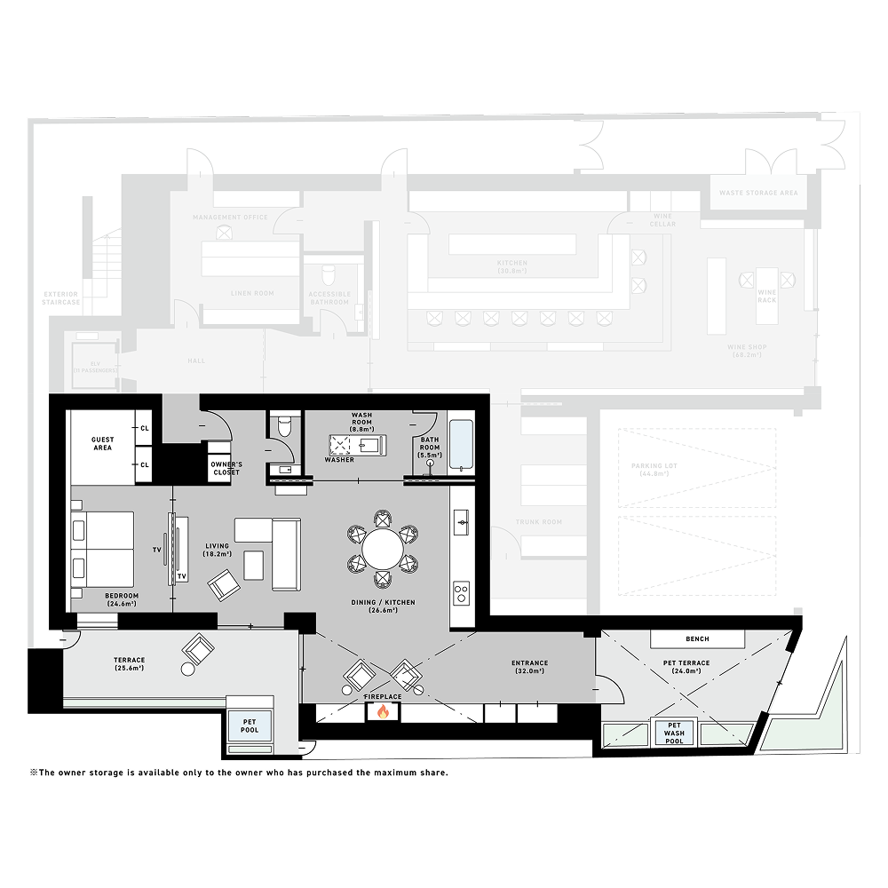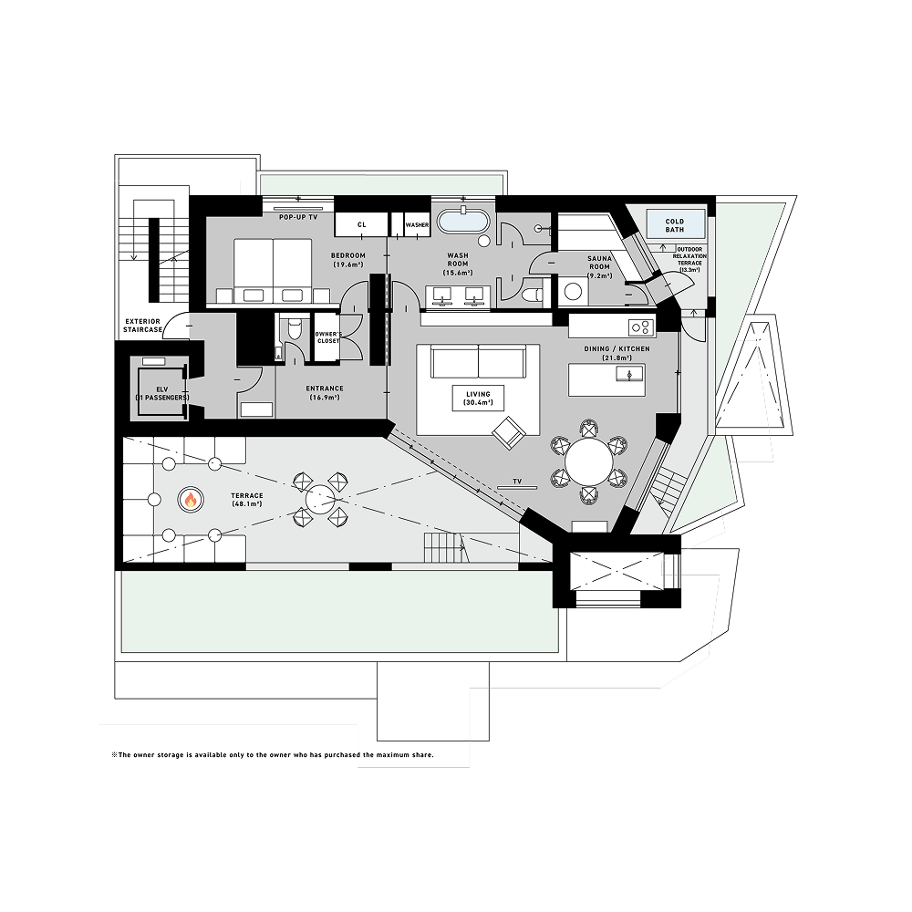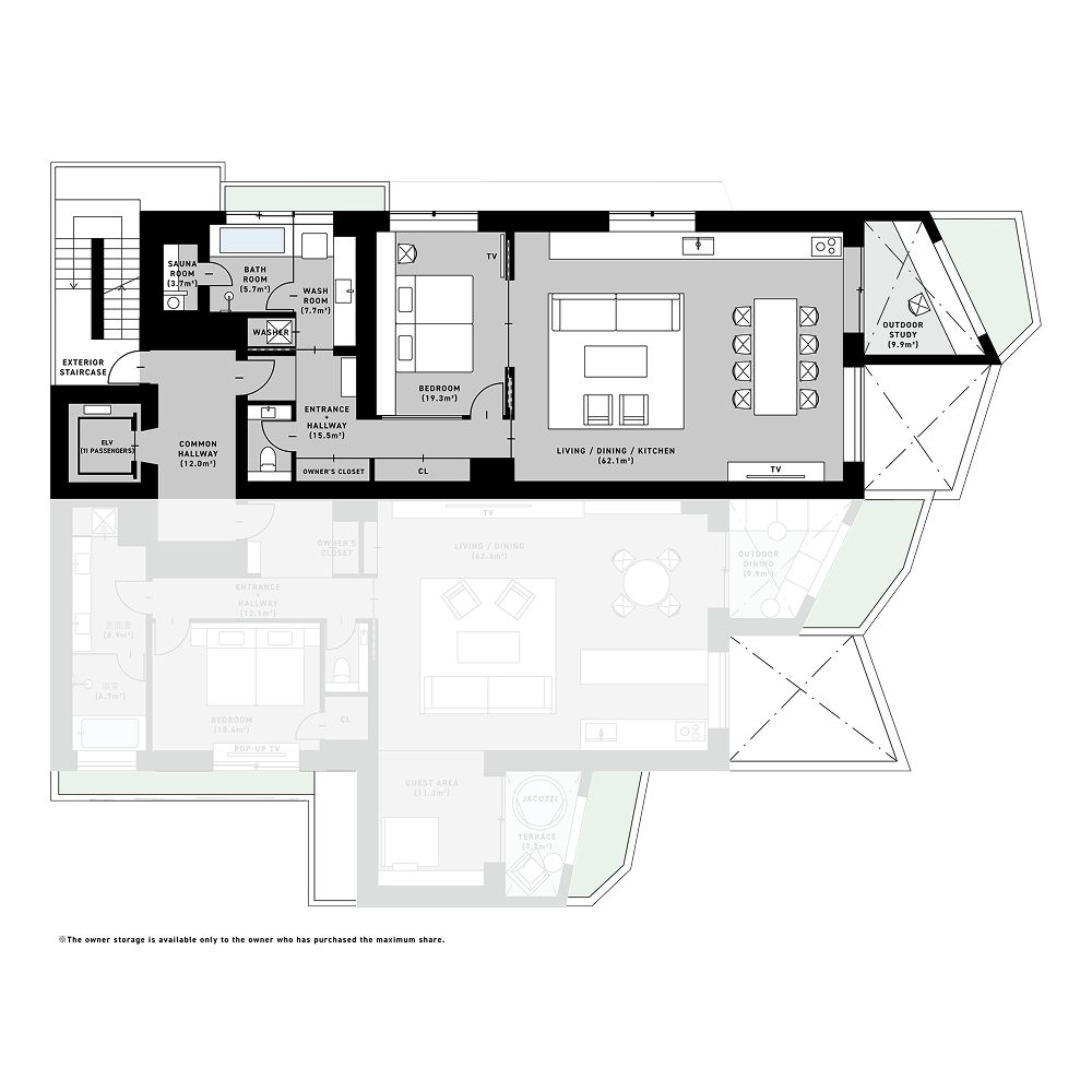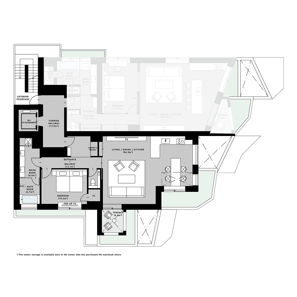 +PENTHOUSE:253.4㎡(119.1㎡ + 134.3㎡) +SOUND:113.48㎡(107.5㎡ + 5.98㎡) +BAR:114.36㎡(108.41㎡ + 5.95㎡) +RETREAT:142.39㎡(125.21㎡ + 17.18㎡) +ATELIER:126.90㎡(117.02㎡ + 9.88㎡) +CHEF:154.79㎡(125.7㎡ + 29.09㎡) +DESK:140.77㎡(129.51㎡ + 11.26㎡) +DOMA:172.66㎡(123.13㎡ + 49.53㎡)