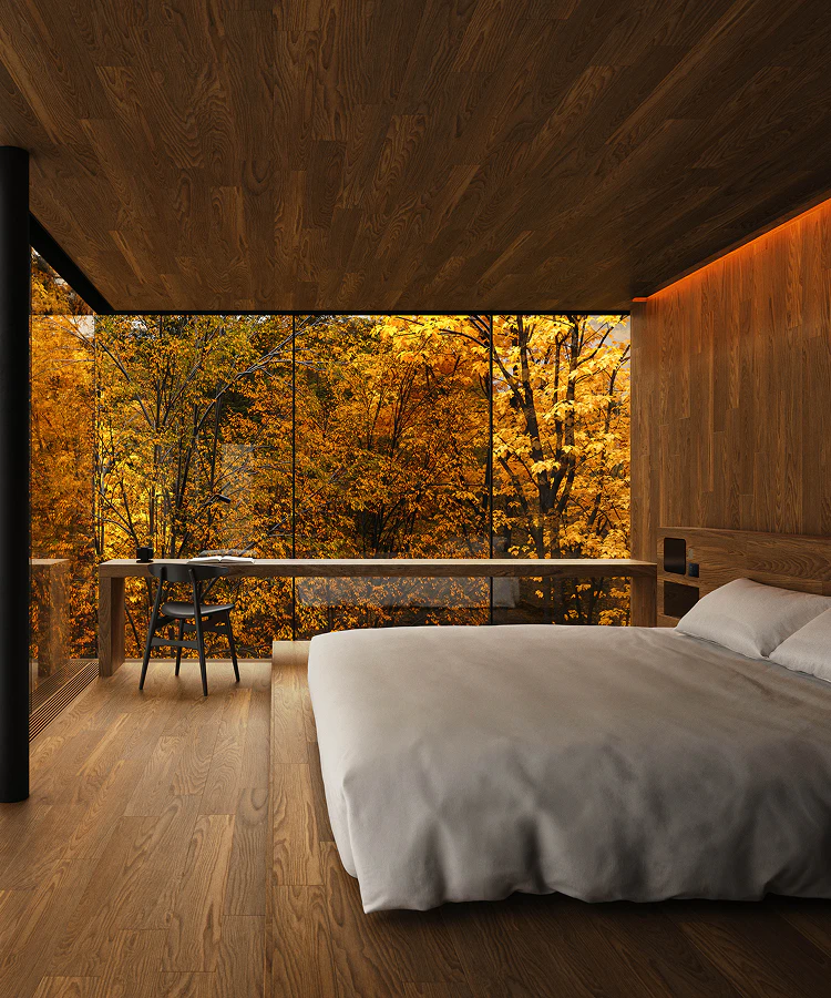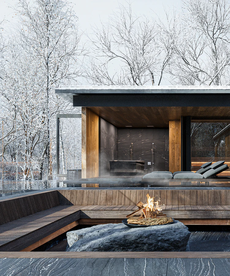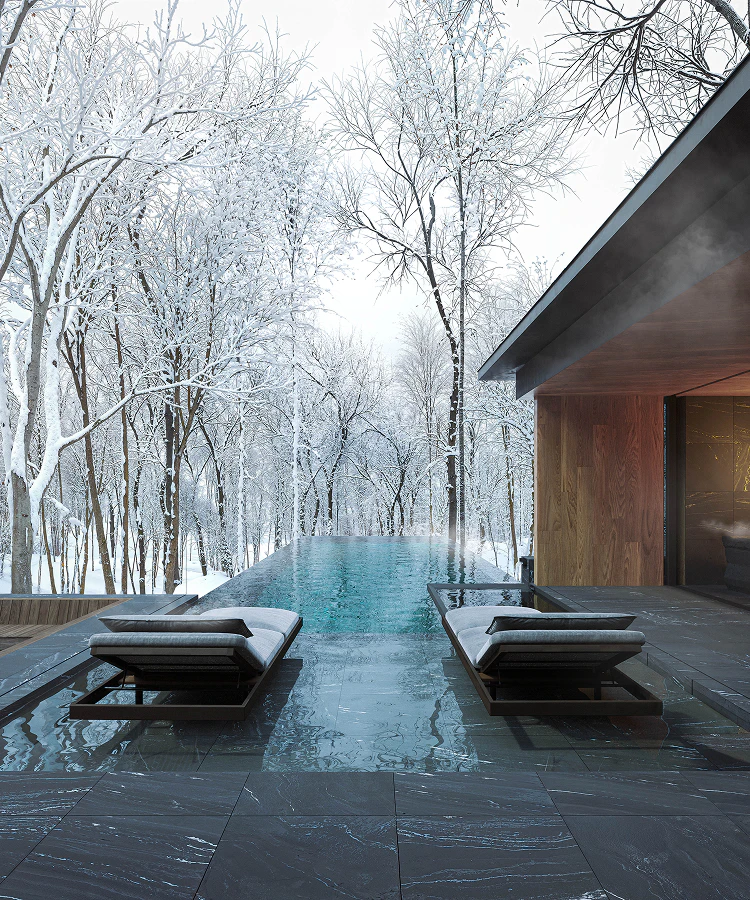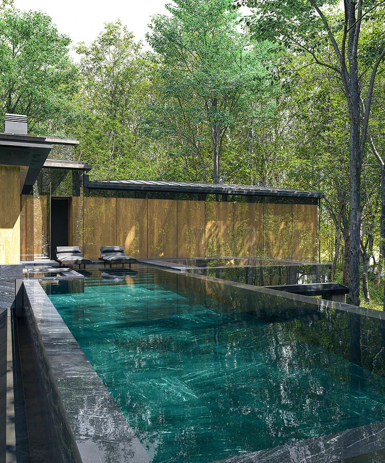 「NOT A HOTEL KITAKARUIZAWA」のフラッグシップモデルとして開業以来ご好評いただいている「IRORI」に、インフィニティプールを新設し、大幅なアップデートを実現しました。 森の中に浮遊するガラスと木の建築というコンセプトはそのままに、地上2階レベルに浮かぶようにプールを配置。 まるで森の中へと泳ぎ出していくように、夏は深い緑に包まれ、冬は白銀の世界へと身をゆだねる——そんな四季の移ろいを全身で感じられる新たな体験を目指しています。