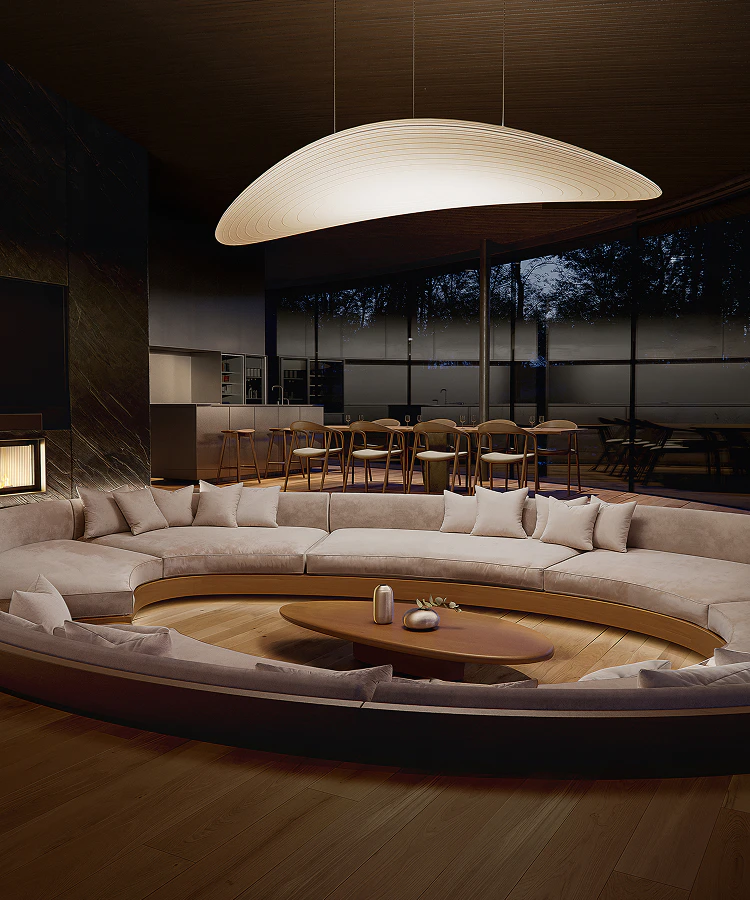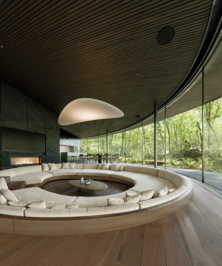 緩やかに弧を描く大屋根が地形に寄り添い、森林の風景を多様に切り取るように設計。屋外と屋内が連続的に溶け合う空間を生み出す。
