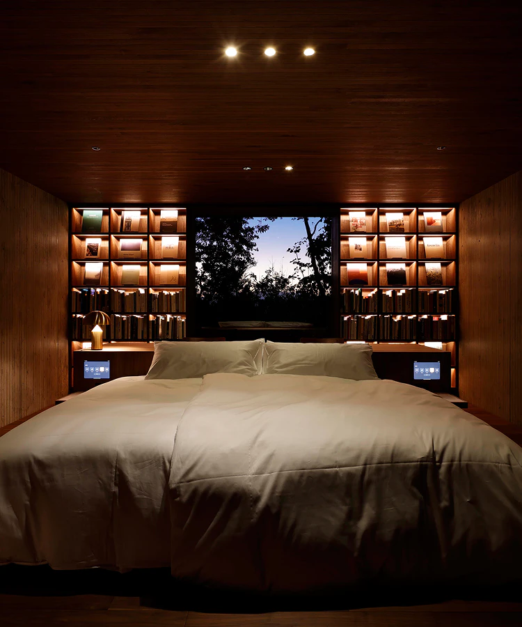 設計はSUPPOSE DESIGN OFFICEの谷尻 誠氏と吉田 愛氏が手がけ、個と集い、静と動という対照的な時間をデザインしている。地上3階建ての離れには書斎と屋上露天風呂、寝室を備え、一人で過ごす時間を豊かにする空間が広がる。対照的に、巨大な本棚が印象的な母屋はリビングやテラスを有し、家族や仲間と過ごす時間を特別なものにする。